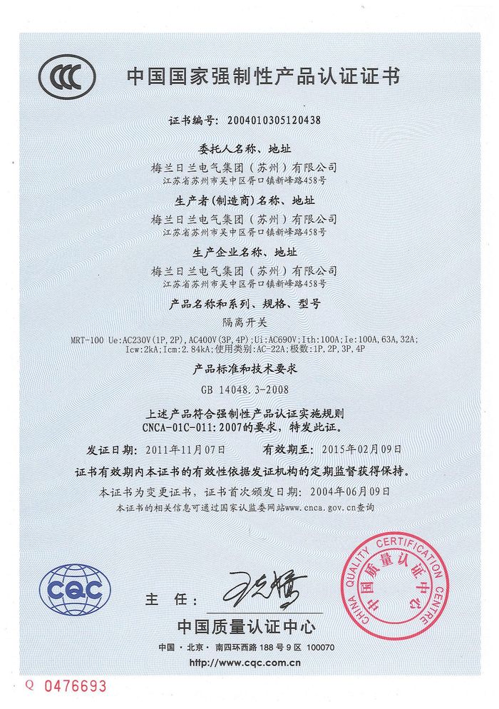 MRT-100隔離開關(guān)資質(zhì)證書