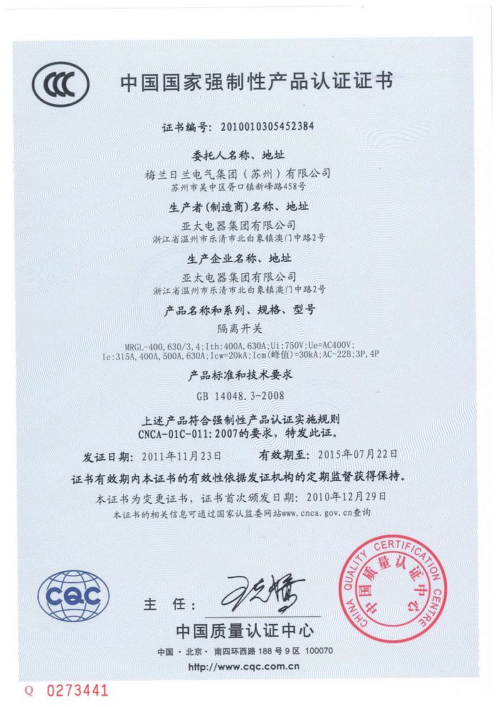 MRGL-400隔離開(kāi)關(guān)資質(zhì)證書(shū)