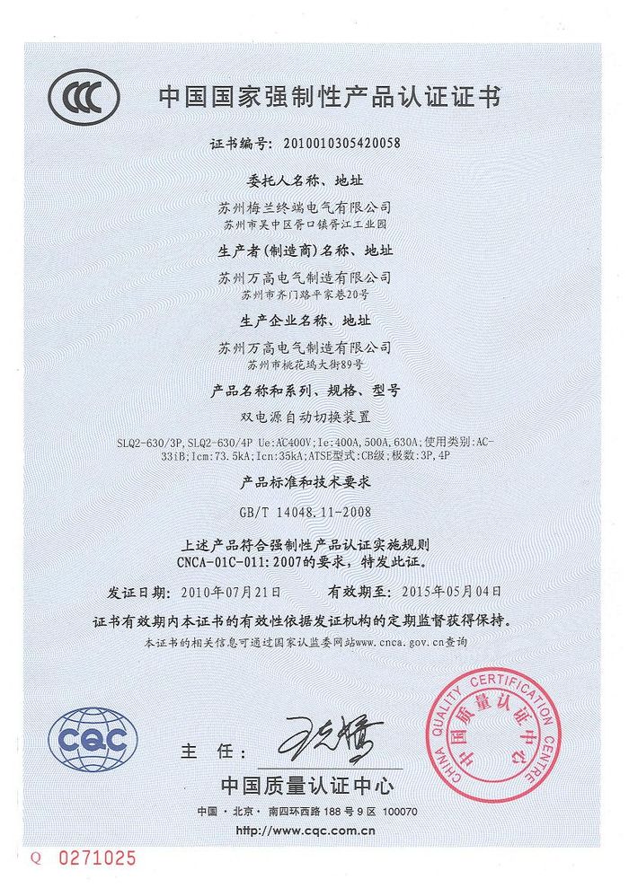 SLQ2-630雙電源資質(zhì)證書