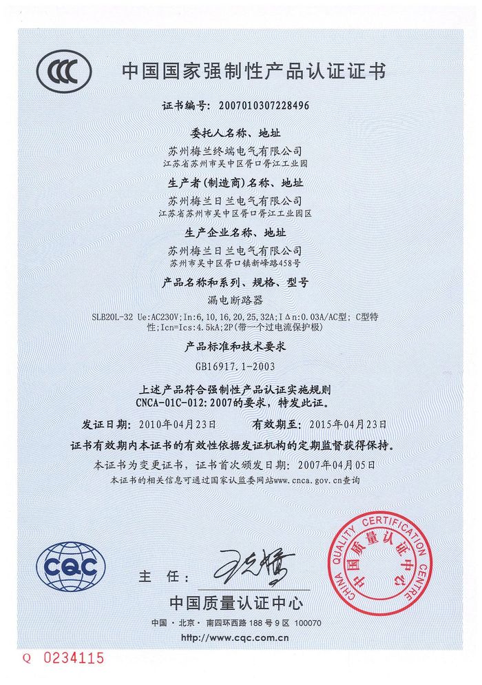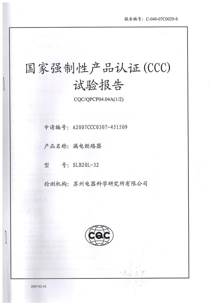 SLB20L-32漏電斷路器資質(zhì)證書