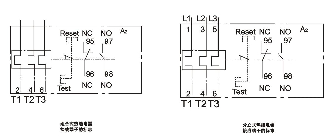 1、具有二種安裝方式,組合式安裝直接插入接觸器,分立式可單獨安裝或安裝在導軌上。