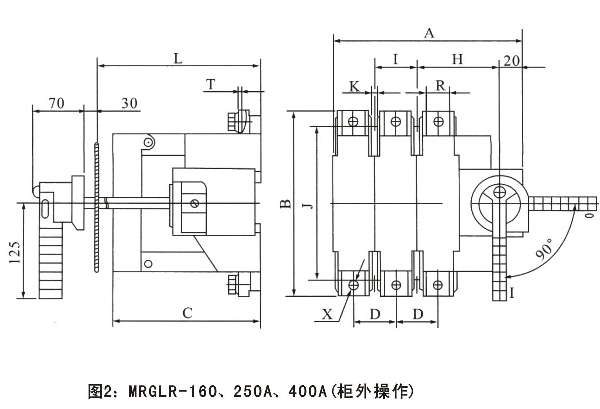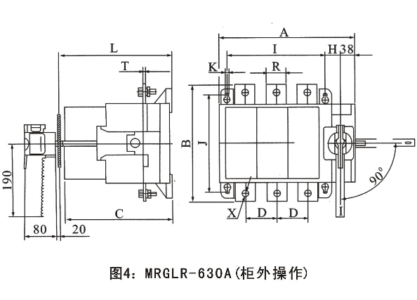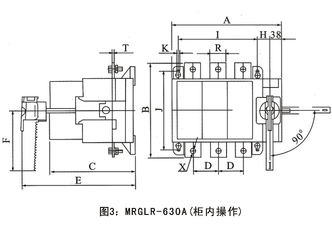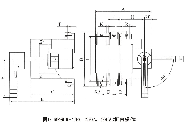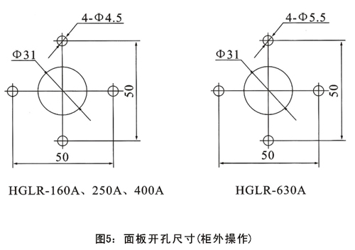 手柄可直接裝在開關(guān)上操作(簡稱柜內(nèi)操作),也可通過加長軸在配電柜門外操作(簡稱柜外操作)。