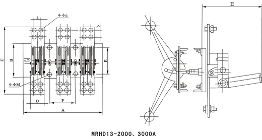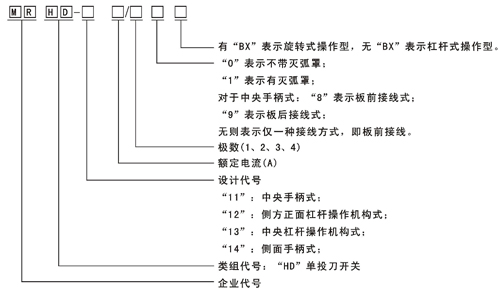 MRHD系列單投刀開關(guān)適用于交流50Hz、額定電壓至380V、直流至220V,額定電流至3000A的成套配電裝置中,作為不頻繁地手動接通和分?jǐn)嘟弧⒅绷麟娐坊蜃鞲綦x開關(guān)用。其中: