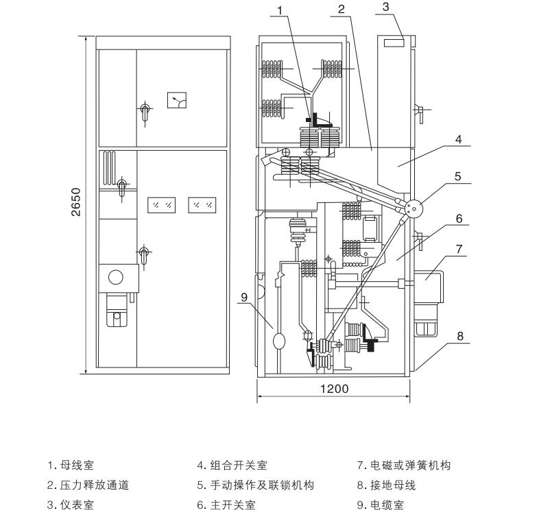 本開關(guān)柜為金屬封閉箱型結(jié)構(gòu),柜體骨架由角鋼焊接而成.柜內(nèi)用鋼板分隔成斷路器室,母線室,電纜室,繼電器室,并可通過門面上的觀察窗和照明燈觀察柜內(nèi)各主要元件的運行情況。為提高開關(guān)柜的技術(shù)性能,各主要元件進行了重新設(shè)計(如斷路器,旋轉(zhuǎn)式隔離開關(guān)等),根據(jù)柜體布置,繼電器室可安裝繼電器,門上可裝設(shè)信號繼電器、指示儀表、信號燈,轉(zhuǎn)換開關(guān)安裝于操作小室。后面為母線室,下面為電纜室,用戶可方便地進行接線,前面為斷路器室,方便了開關(guān)柜主開關(guān)的檢修,柜體內(nèi)部機構(gòu)參見圖1、圖2和產(chǎn)品說明書。
